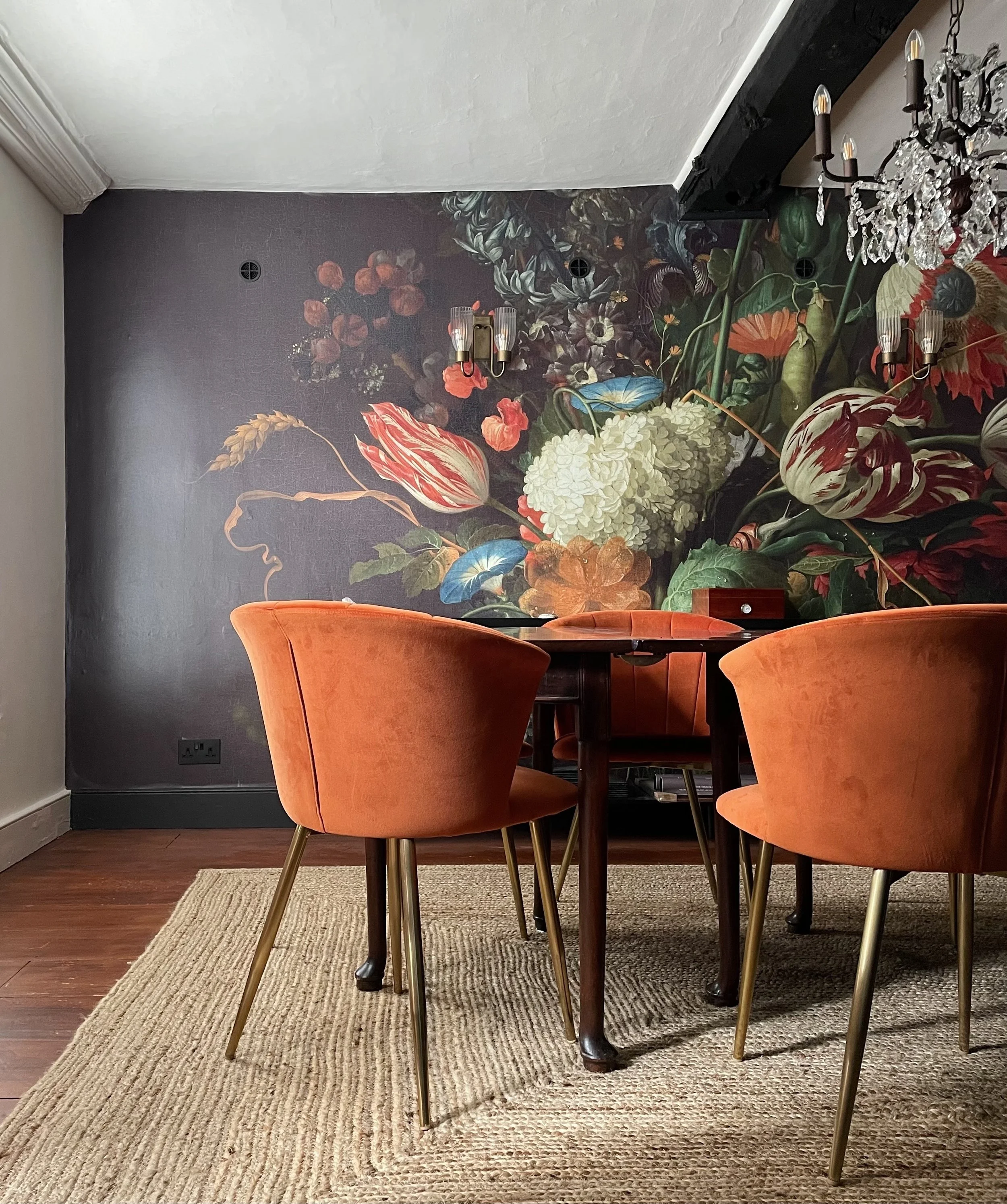 The room, in a 17th Century townhouse, already boasted an abundance of period features including panelling, fireplace, and low ceiling with timber beams, providing a lovely backdrop for the mahogany table, yet calling for some modern updates to avoid the overall look feeling too formal or dated.